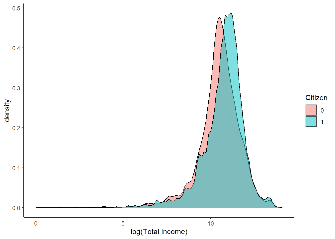 ggplot(data = acs_workers, aes(x = log_income, fill = as.factor(citizen_indicator))) +